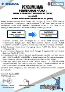 Sesuai Undang-undang No.4 Tahun 2023 tanggal 12 Januari 2023 tentang Pengembangan dan Penguatan Sektor Keuangan (P2SK), maka bersama ini kami sampaikan bahwa telah dilakukan perubahan nama PT. BPR Citra Darian sehingga secara resmi nama perseroan berubah sebagai berikut :